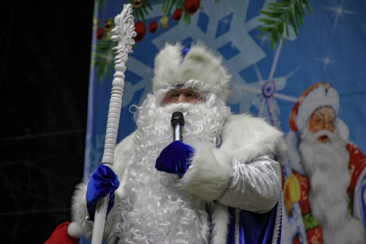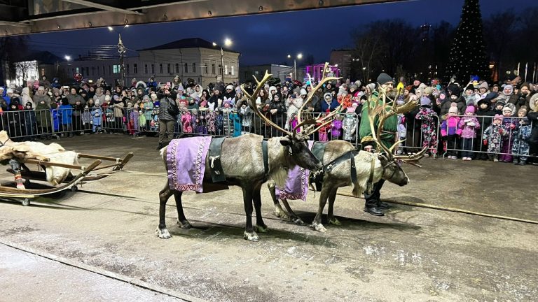 Волшебники прибыли на санях, запряженных оленями. Праздничная программа подняла настроение жителям города, которые пришли на представление целыми семьями.