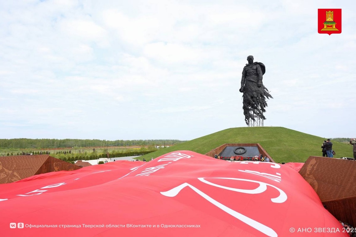 У подножия Ржевского мемориала Советскому солдату ветераны Великой Отечественной войны, герои специальной военной операции, участники экспедиции — представители молодежных патриотических и волонтерских организаций из России и Республики Беларусь, развернули самое большое в мире Знамя Победы как символ памяти о всех тех, кто отстоял страну в годы Великой Отечественной войны. Состоялась церемония возложения цветов к монументу.