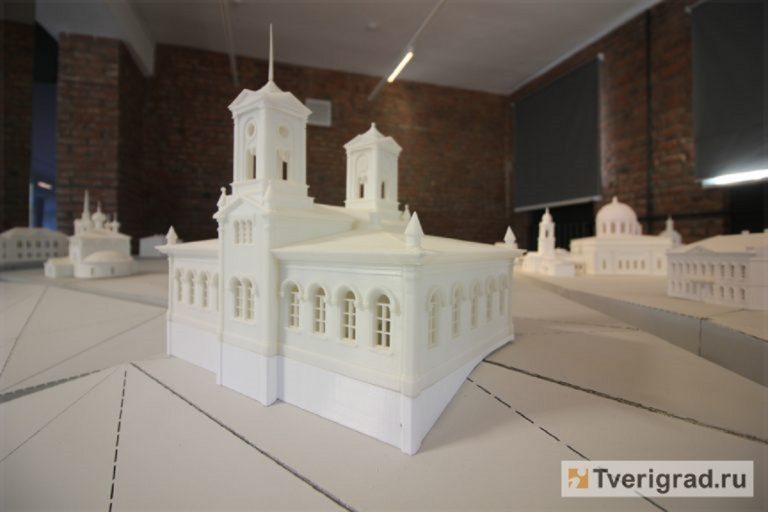 С другой стороны — возрождаемая древность. Половину пространства музея занимает огромный серо-белый макет, на котором представлен утраченный в XX веке архитектурный облик Ржева.