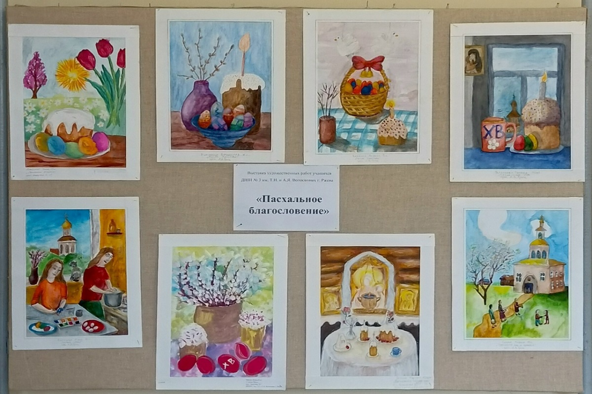 В преддверии великого праздника Светлой Пасхи юные художники ДШИ№3 им. Т.И. и А.Я. Волосковых города Ржева организовали выставку рисунков "Пасхальное благословение".