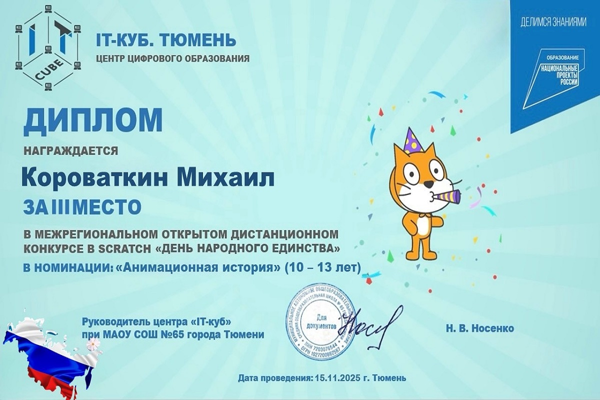 Ребята отлично справились: продемонстрировали навыки работы с графикой, продумали сюжеты и достойно представили наш центр. А ещё Михаил занял третье место в конкурсе по программированию в среде Scratch «День народного единства» (организатор — IT‑cube Тюмень). В состязании сошлись юные программисты со всей страны, представившие анимационные и интерактивные проекты, посвящённые теме единства народов России. Наш участник разработал оригинальный проект, где через визуальные образы раскрыл идею сплочённости и взаимопомощи.
