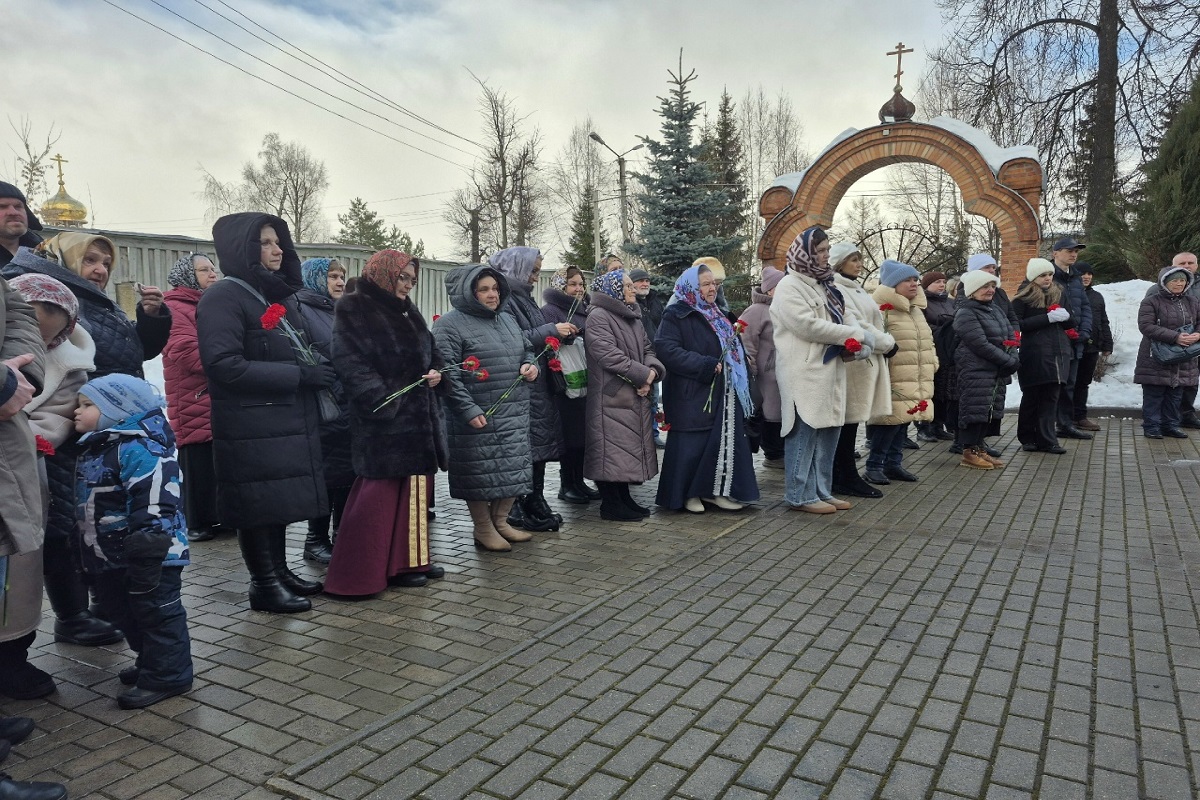 К мемориальной доске у Покровского храма были возложены цветы в память о великом подвиге советского народа и о солдатах-победителях, подаривших нам мирное небо, о всех невинно убиенных жителях Ржевской земли.
