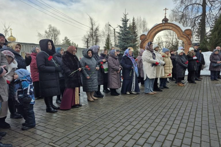 К мемориальной доске у Покровского храма были возложены цветы в память о великом подвиге советского народа и о солдатах-победителях, подаривших нам мирное небо, о всех невинно убиенных жителях Ржевской земли.
