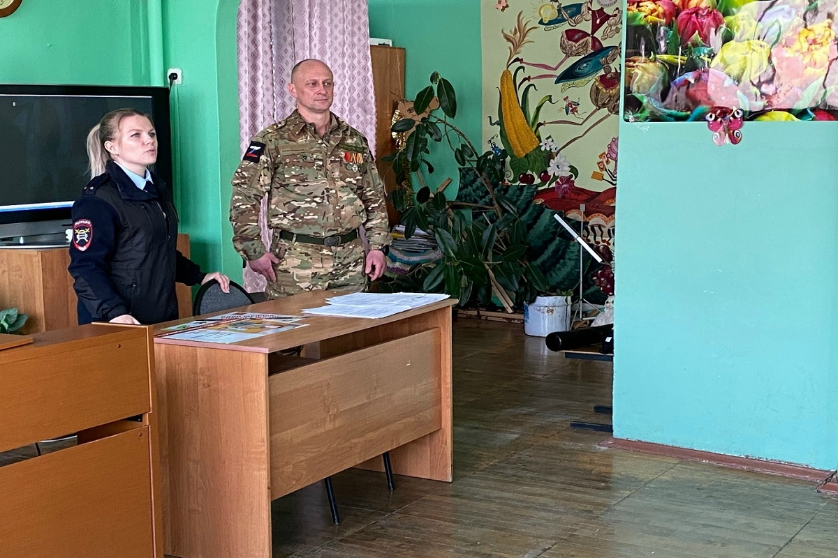 На встречу с ребятами пришли инспектор Госавтоинспекции Кристина Александровна Варшавская и участник специальной военной операции Иван Александрович Корсаков. Они рассказали о своем опыте и важности патриотизма и службы Родине.